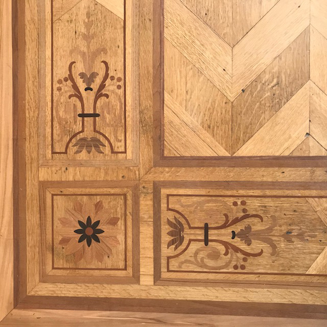Het oude donkere parket werd geschuurd tot op het blote hout. Tot ieders verrassing kwam prachtige houten mozaïc en inlegwerk tevoorschijn. Deze werd gefixeerd met een matte vernis. Een gedeelte van de vloer werd vervangen door cementtegels met kleuraccenten in diep blauw en watergroen. De geschilderde baksteen werd gezandstraald en alle muren werden opnieuw geschilderd, de houten lambrisering kreeg een nieuwe eindlaag.