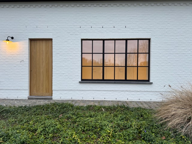 Een voormalige, verbouwde L-vormige hoeve krijgt een volledige, hedendaagse make-over. De achterliggende glazen veranda wordt verwijderd en de vrijgekomen oppervlakte wordt opgenomen in de woonruimte met open zicht op de tuin. De voordien weggestoken keuken krijgt aansluiting met de woonruimte. Alle bestaande infrastructuur in de klassieke Vlaamse donkere kleur ( haard, buitenschrijnwerk, keuken, … ) wordt verwijderd en vervangen. De badkamer krijgt een hedendaagse inrichting met ingetogen materialen en zachte kleuren door gebruik te maken van travertin. De nachthal en ouderslaapkamer worden ook grondig aangepakt. De donkere eiken vloerplanken worden opgefrist en krijgen hun natuurlijke look terug. De deuren van de ingemaakte kasten worden vervangen en gelakt.