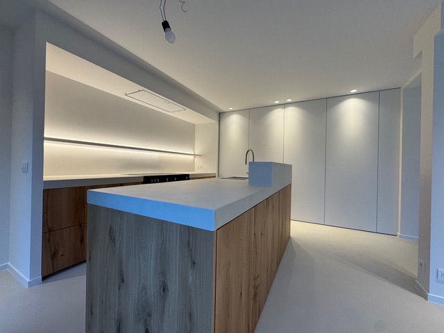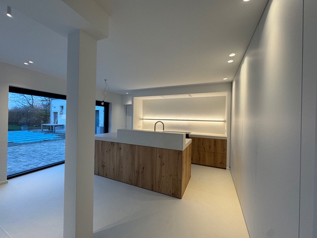De hoogwaardige afwerking met eik, travertin, zachte witte tinten en minimalistische uitvoering van de inrichting zorgt voor een rustgevende leefruimte.